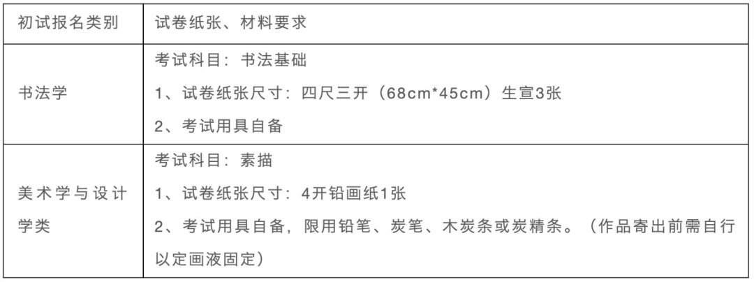 考生在2023年1月8日前按初試報(bào)名類別準(zhǔn)備好紙張材料等。考生須提前準(zhǔn)備不小于4開(57.5cm*45cm)的試卷包裝密封袋。
