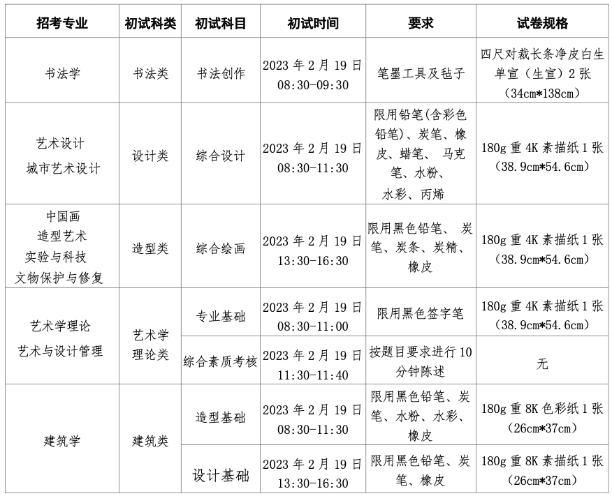 考生按以下試卷規(guī)格準(zhǔn)備,尺寸±0.5cm內(nèi)均屬正常范圍。書法學(xué)專業(yè)可準(zhǔn)備2張草稿紙,其他考試專業(yè)禁止攜帶草稿紙。