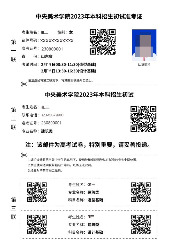 2.書法學(xué)、建筑學(xué)專業(yè)準(zhǔn)考證第三聯(lián)印有2條考生信息二維碼,其他專業(yè)印有1條考生信息二維碼,準(zhǔn)考證樣圖如下: