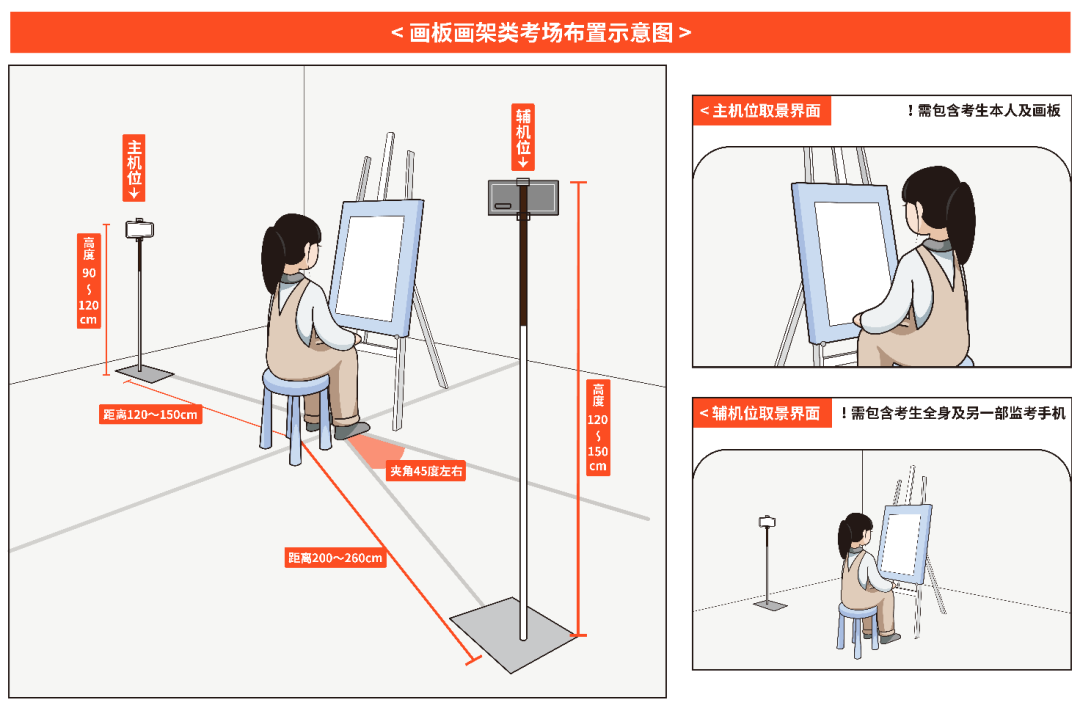 (一)使用畫板、畫架考場:主機(jī)位于考生側(cè)方,輔機(jī)位于主機(jī)位對側(cè)的側(cè)后方。考場布置示意圖如下: