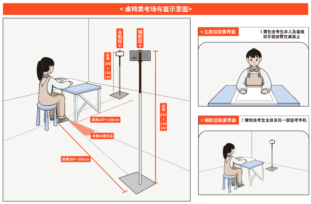 考生提前準(zhǔn)備1間安靜、獨立、封閉的室內(nèi)考試空間作為考場,1個考場限1名考生進(jìn)行考試,不得有他人在場??紙鰠^(qū)域不得存放書籍、畫稿、雕像、照片、展示畫、鏡子等與考試無關(guān)的物品;實在無法移除的障礙物,需用單色布匹進(jìn)行遮擋。