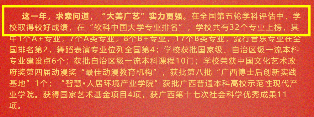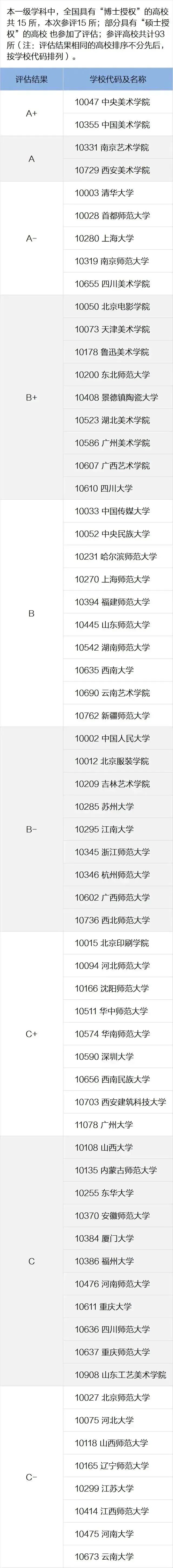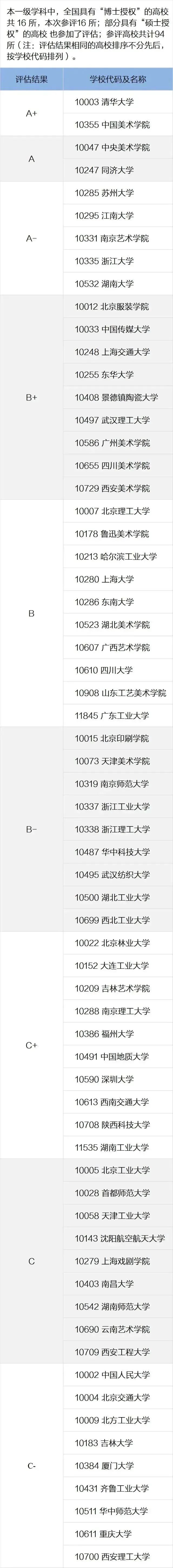 12月31日,南京藝術(shù)學(xué)院透露該校在教育部第五輪學(xué)科評估中,80%學(xué)科進(jìn)入A類,傳統(tǒng)優(yōu)勢學(xué)科取得重大突破,獲評A+等級,設(shè)計學(xué)、藝術(shù)學(xué)理論進(jìn)一步提升。南京藝術(shù)學(xué)院第四輪學(xué)科評估結(jié)果:美術(shù)學(xué)A、音樂與舞蹈學(xué)A-、設(shè)計學(xué)A-、藝術(shù)學(xué)理論B+、戲劇與影視學(xué)B+12月31日,廣西藝術(shù)學(xué)院透露在全國第五輪學(xué)科評估中,學(xué)校取得較好成績。廣西藝術(shù)學(xué)院第四輪學(xué)科評估結(jié)果:美術(shù)學(xué)B+、音樂與舞蹈學(xué)B、設(shè)計學(xué)B、藝術(shù)學(xué)理論C+— 設(shè)計學(xué)取得可喜進(jìn)步 —
