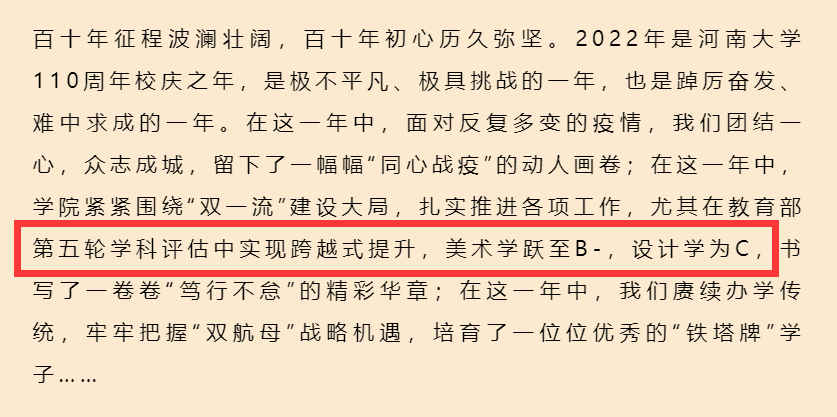 1月21日,河南大學(xué)美術(shù)學(xué)院透露該校美術(shù)學(xué)躍升為B-,設(shè)計學(xué)為C。河南大學(xué)第四輪學(xué)科評估結(jié)果:美術(shù)學(xué)C-—美術(shù)學(xué)保持好成績、設(shè)計學(xué)取得突破—