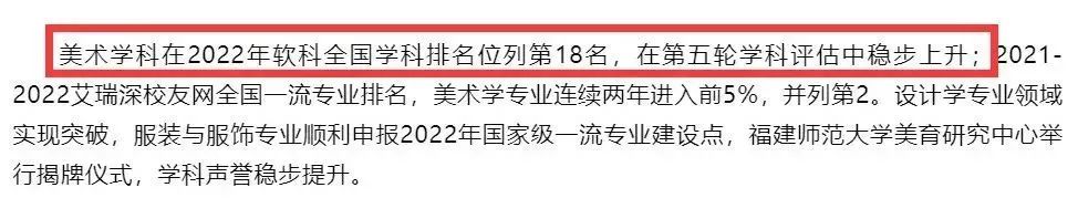 1月15日,福建師范大學(xué)美術(shù)學(xué)院透露美術(shù)學(xué)科在2022年軟科全國學(xué)科排名位列第18名,在第五輪學(xué)科評估中穩(wěn)步上升。福建師范大學(xué)第四輪學(xué)科評估結(jié)果:美術(shù)學(xué)B1月19日,南通大學(xué)藝術(shù)學(xué)院透露美術(shù)學(xué)在第五輪學(xué)科評估中取得新突破。